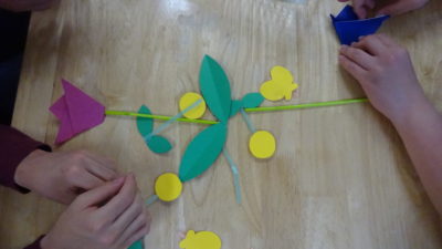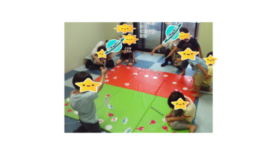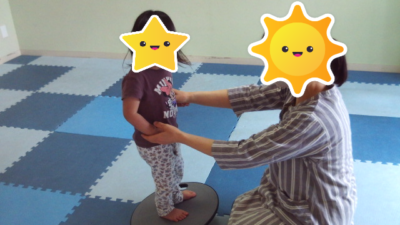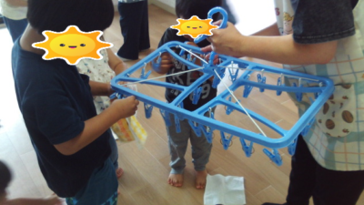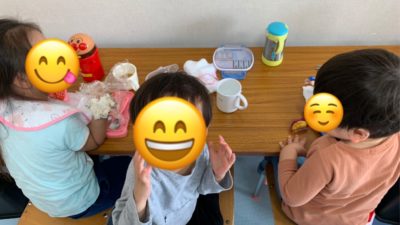 お散歩から帰って「ただいま」が済むと、小さいお友だちふたりが椅子に座ってひと休み。疲れちゃったかな?頑張って歩いたね。