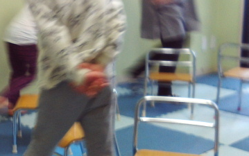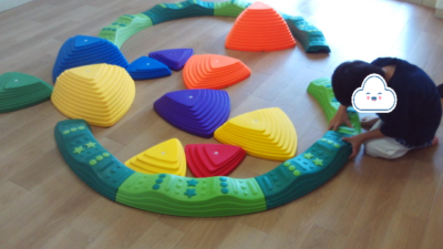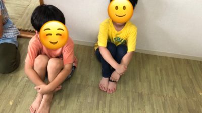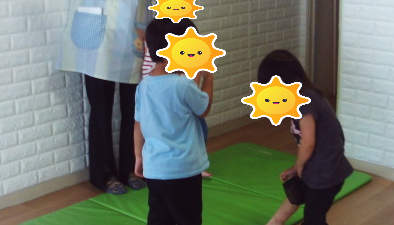 スタッフに手を添えてもらうと、安心して平均台を渡っていきます。足下を見てゆっくりゆっくり渡りました。