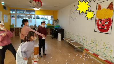 みんなでおに退治~‼ ワクワク上石神井 2022.02.03 今日のワクワク上石神井の様子です。 新聞紙をおもいきり破いて ひらひらと花吹雪のように飛ばしたり 丸めたり、たくさん遊んだら やぶいた新聞紙をみんな一生懸命袋に詰めてました♬ ピアノの音に合わせて走ったり、ゆっくり歩いて止まりました。 よーくピアノを聞いて上手に止まることができました。 午後はおに退治頑張りました! 型はめたまごに挑戦~♪ 活動で作った新聞を入れた袋にペンでお絵描き♪ 大好きなピンクでお絵描き~ 何色にしようかな~? 黄色にしようかな♪ お絵描きも楽しめました♥ 大串