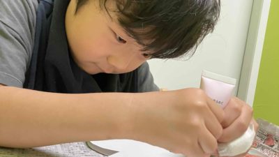 スプーンで色付きのシャボン玉をすくって模様をつけていきました♬