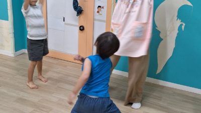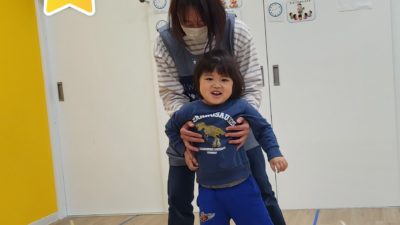 つかまえる際に「ぱく」と言って職員を食べる真似をしたり、クマ役以外のお友だちが「くまさん起きてー」といったら、クマ役のお友だちが起き上がるのですが、少し間をおいてから「がおー」と起き上がったりする姿がみられ、楽しんで行うことができました☆
