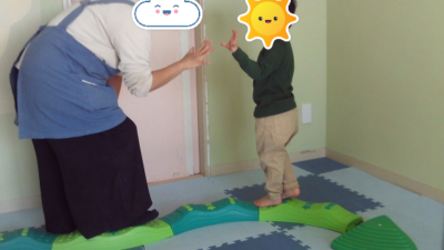 今日の午前中の活動は、ボール運びレースをしました。「大型バスに乗ってます、ボールを順に渡してね、お隣りへ、はい、お隣りへ」と歌いながら、隣のお友だちにボールを渡していきました♪初めは一つのボールで、次は二つのボールを使いボール運びを行い、とても上手に出来ましたよ♪終わってからボール遊びをしました。