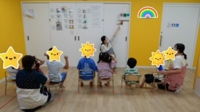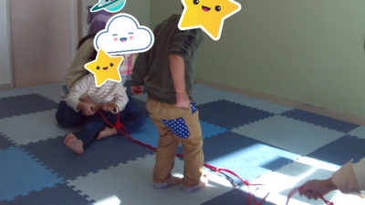 午前中の活動は、クモの巣とぞうさんをしました。ぞうさん役のスタッフやお友だちが、一人一人の名前を呼んで「一緒に遊ぼう」誘います。誘われた子は後ろについて一列になって歩きました。最後は「おうちにかえろう」で席に座ります。とっても上手に出来ましたよ。