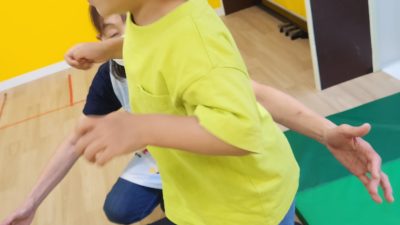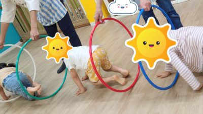 ボール渡しは外向きに座って隣のお友だちへ右回りと左回りで一回ずつボールを渡して次に縦一列に並んで手を伸ばして頭の上から後ろのお友だちへボールを渡したりして最後の席のお友だちが先頭まで持っていく!をしました。小さいお友だちには後ろへが少し難しかったですががんばって手を伸ばしてチャレンジしてくれました😊