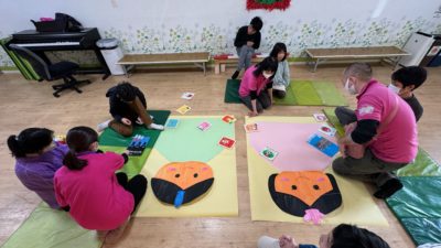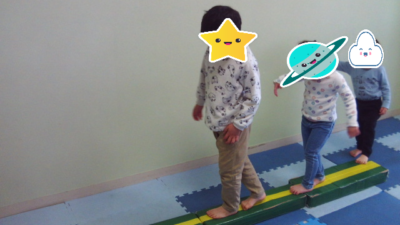 梯子では、立ったり四つん這いになったりしながら一歩一歩ゆっくりとバランスをとって渡ることができていましたよ。スタッフの手を持たないで渡ってみようと挑戦をするお友だちもいました!ケンケンパでは片足跳びは難しいお友だちもいましたが、両足を閉じてグーグーパーの足で頑張っていましたよ☆