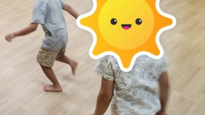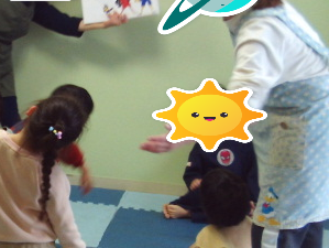 ボール渡しはまるーく椅子を並べてすわってボールを「お隣りへハイッ!!」でとなりのお友だちに渡していきます😊ボール渡しが終わるとボール入れをしました。タンバリンを使って音が鳴っている間かごにボールを入れる。や色を指定してボールを入れるなどしました🎵