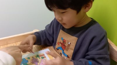 今日の午前中の活動は、しっぽ取りをしました。始めはスタッフにしっぽをを付けて、子どもたちが取りました。次に子どもたちにしっぽを付けスタンプが取り、最後にみんなでしっぽ取り合いました。体を動かしながら楽しんでいましたよ。