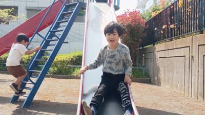 滑り台では、階段の手すりを両手でしっかりと握り一段一段よく見ながら