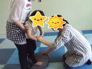 バランスボードをしよう♪ ワクワクゆらゆらするけど、上手に立てたよ♡ 2024.06.03 こんにちは(*^-^*) 今日はバランスボードをしました。不安定なバランスボードの上でバランスをとることは足腰だけでは難しく、体幹や上半身の筋肉も必要になります。 そして三半規管の感覚・柔軟性・足裏の感覚を養うことができ、トータルでバランス感覚を養うことも出来ます。 なんどもチャレンジしていたお友達もいました✨ 足底をボードにしっかりつけよう! ゆらゆらするけど、上手に立てたよ♡