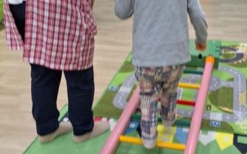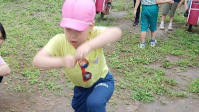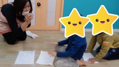 今日の午前中の活動は、「動物歩き」をしました。カードの動物の動きを真似して動きます。ウサギになってピョンピョン跳んだり、ワニになって床にお腹を付けて手と足を使って進んだりしました!全身を使って楽しみましたよ。