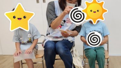 個別をしていない時間に「かさ」の製作をしました。クレヨンで描き、シール貼りをして傘を作っていきました。大きな子はハサミと糊、モールを使って傘を完成させていましたよ♪ 可愛い傘が出来ました。