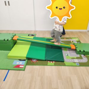 今日の午前中の活動は、サーキットをしました。バランスストーンと傾斜を登る平均台をしました。一人で行う子、スタッフと手をつないで行う子と発達に合わせて楽しみました。