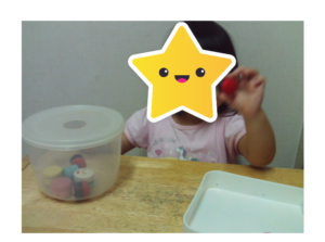 エビカニクス🦐🦀 ワクワク 2024.07.09 こんにちは。 午前中エビカニクスの音楽に合わせて、踊りました。 写真は「カニ」の所で、指がカニさんになっています(*^-^*) サーキットは、平均台をしました。平均台を進んだら一度静止。それからジャンプをしてマットに着地しました。 個別で丸い積み木を穴落としした後、トングで掴んでタッパーに移動させました。 トングを指先に力を入れて握る練習をするとき、「音がする~♪」カチカチと合わさる音に反応していました。