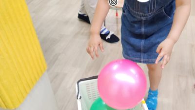 果物に見立てたカラーボールを持ち、ハードル・一本橋渡しを通り
