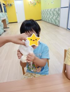 小麦粘土と縄跳び りぼん 2024.07.16 こんにちは 金曜日のりぼんでは小麦粘土を行いました。 袋の中で粘土をこねこね… 台の上でこねたら、粘土で自由に形を作っていきます。 とても集中していてみんな楽しそうに取り組んでいました。 そのあとは縄跳びをみんなで跳びました! どちらも盛り上がって、とても楽しい時間が過ごせました。 りぼん