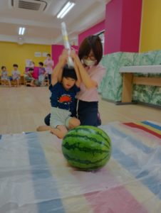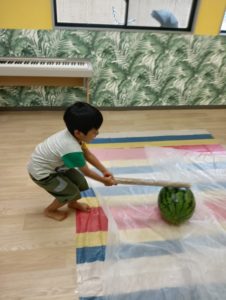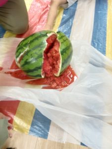スイカ割り🍉 りぼん 2024.08.06 こんにちは 月曜日のりぼんではスイカ割を行いました🍉 みんな頑張って棒を振りました! 割れたスイカはおやつにみんなで食べました。 そのあとは夏まつりの工作でちょうちんを作りました。 りぼん