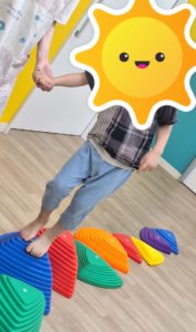 今日の午前中の活動は、サーキットをしました。平均台の梯子を渡ってジャンプ!バランスストーンの上を歩いてゴールしました。梯子は初めは平面、その後、低い→高いの傾斜を付けて渡りました。一人で渡っている子、スタッフが手をとり渡る子、梯子に手をついて渡る子と様々でしたが、みんな頑張っていましたよ!