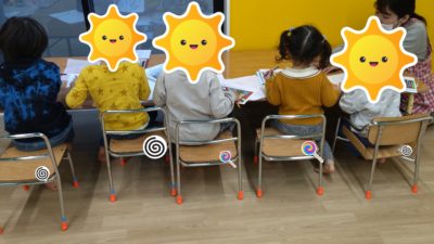 今日の午前中の活動は、「踏切ごっこ」をしました。小さいフラフープをハンドルに見立てて車を運転して走ります。「カンカンカン」と踏切の遮断機が下りると車はストップ!走ったり止まったりして、たくさん体を動かしましたよ!