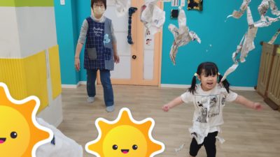 午後は個別としっぽ取りをしました。しっぽ取りは洗濯ばさみで作ったしっぽを服に付けて、お友だちのしっぽを取ったり、取られないように逃げたりして楽しみました。