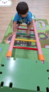今日の午前中の活動は、「サーキット」をしました。巧技台の梯子とバランスストーンをしました。梯子は低い⇒高いの傾斜を付けて渡りました。一人でわたったり、スタッフと手を繋いでわたったり、手をついてわたったりと、個々のやり方で楽しみました。