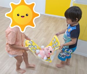 今日の午前中の活動は、タオルリレーをしました。タオルの両端を2人で持って、次に待っているお友だちの所まで運びます。タオルに乗せて運ぶのは、ケガをしたくまちゃんのぬいぐるみ。落とさないようにみんなで病院まで運んであげました。2回目は、治ったくまちゃんをお家まで運んでくれましたよ。みんなで救急車で運んでいる気持ちになり楽しみました。