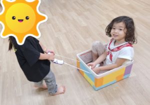 個別をしていない時間にタクシーごっこをしました。タクシーごっこでは、お友だちにタクシーを走らせてもらったり、お友だちを乗せて引っ張て走らせたりを楽しんでいました。