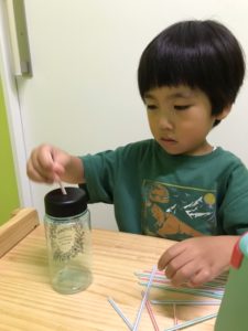 その後、ボール遊びをしました。傘を逆さまにしてその中にボールを投げ入れたり、カゴにボールを集めたり、キャッチボールをしたりして遊びましたよ。