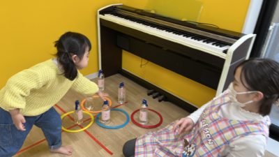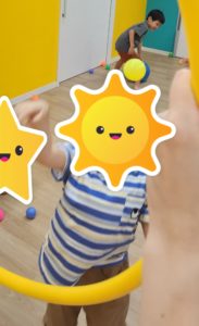 その後はボール遊びをしました。今日はフープを用意し、その中にボールを投げて通していきました☆