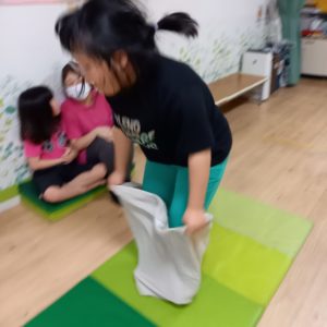 ③ジャンボ巾着袋に入ってマットの上をジャンプ!