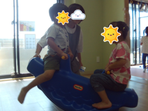 午後の様子です♬ ワクワク1・2・3… 気持ちいいね 2024.10.02 こんにちは 今日の午後は、ゆらゆらの感覚を沢山楽しみました 一つ目のゆらゆらは、シーソーです 順番に乗り、みんないい笑顔! 笑い声や「オーイ」「イエィ!」の掛け声も聞こえて いましたよ♪ 2人共いい笑顔!(^^)! 二つ目のゆらゆらは、タオルブランコです タオル包まれて気持ちよさそう! 「1・2・3…」と数を数えながら揺られました 1・2・3…気持ちいいね