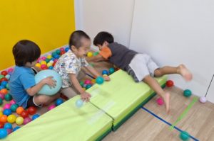 その後はボール遊びをしました。ボールプールを作り、中に入って泳ぐようにしたり、中と外でボール投げをしたりしました。風船遊びも一緒にしました。手のひらで宙にポンポンしたり、大きいフープの中をくぐらせたりしましたよ。楽しかったようで、お片付けの時間になっても「もっと遊ぶ!」の声が聞かれたました。
