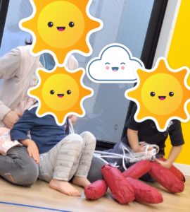 今日の午前中の活動は、お芋ほりをしました。お芋に付いている長い紐を、両手を交互に使って引っ張ります。紐をたぐり寄せてお芋が取れると、嬉しそうに抱えてたり、食べる真似をしたりする子もいましたよ♪