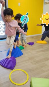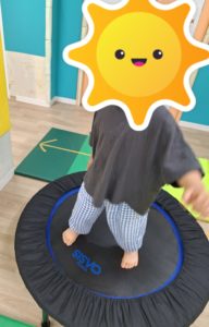 その後はサーキットをしました。バランスストーンとフープを輪にして並べ、そこを渡って歩きました。トランポリンのコーナーも作り、たくさん体を動かしました。