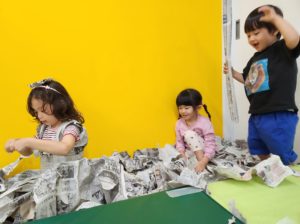 新聞遊びでは、新聞紙のドレスを作って着たり、踏切ごっこをしたり、拳銃を作ったりしてそれぞれが楽しんでいましたよ。みんなで新聞紙のブールに入ったりもしましたよ。