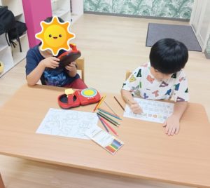 前半はアルファベットに色を塗ったり、おもちゃで遊んだり、