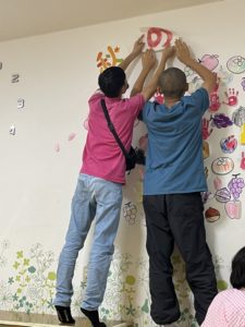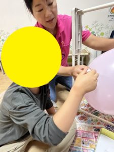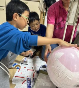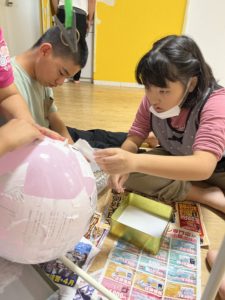 ピニャータ作り(紙貼り)! りぼんU 2024.10.08 こんにちは。 10月8日(火)のりぼんUではピニャータ作り第二工程の紙貼りをしました。 子ども達はとても集中して真剣にかみを貼ってくれました。 中学生のお兄さんは壁面制作のお手伝いをしてくれました。 りぼんU