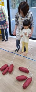 今日の午前中の活動は、おいもほりをしました。両方の手を交互に動かし長い紐をひっぱってお芋をとりました。右手、左手と交互に持ち替えて紐を引っ張ることは、経験がないと難しく、初めての子もいましたが、段々上手に出来るようになりましたよ。
