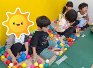 その後は、ボール遊びをしました。ボールプールに入ったり、大きなボールでキャッチボールをしたり、バウンドさせたり、風船に紐を付けてぽんぽんと叩いたりしました。カゴにボールをたくさん集めたり、同じ色を集めて並べたりしている子もいてそれぞれが楽しんでいましたよ。