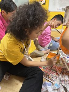 ピニャータ作り(色塗り) りぼんU 2024.10.17 10/15(火)のりぼんUの活動です。 今日もピニャータの色塗りをしました。 水色、黄色、オレンジ、黄緑の中から 何色にするかをみんなに聞き、多数決で 火曜日のピニャータはオレンジ色に決まりました! 交代交代で丁寧に色を塗っていき 最後は白いところがなくなり、綺麗に仕上がりました★ りぼんU