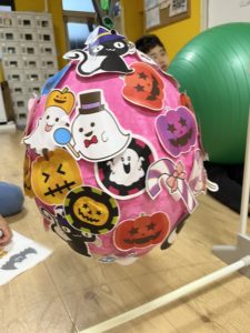ピニャータかざりつけ りぼんU 2024.10.18 10/18(金)のりぼんUでは ピニャータの最後の仕上げ、飾り付けをしました★ ハロウィンのイラストをペタペタ貼っていきました。 中学生のお兄さんお姉さんたちは イラストを貼るための養生テープも丸めてくれました! 金曜日のピニャータが完成しました! とうとう来週はみんなで作ったピニャータを割ります! お楽しみに♡ りぼんU