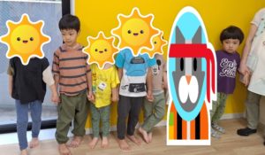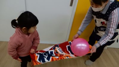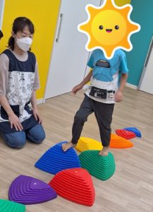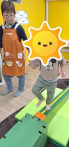 今日の午前中の活動は、サーキットをしました。低い⇒高いの平均台からのジャンプ、トンネル、バランスストーンをしました。一人の大きいお友だちの提案により、大きいお友だちが小さいお友だちと手を繋いだことで、みんなで素早く並ぶことができました。平均台を渡ることもとても上手になり、渡り終わってからのジャンプもかっこよかったのです。