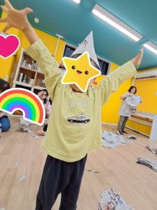 今日のワクワク上石神井の様子です☆ ワクワク上石神井 2024.10.23 今日もみんなで『おおかみさん、今何時?🐺』を楽しみました♪ おおかみ役に挑戦する子、羊で逃げたい子…それぞれの楽しみ方で盛り上がりました😊 新聞紙では、ホウキを作ってお掃除したり、兜や剣を身に着けて戦いごっこをしたり🔥 同じ素材なのに全く違う遊び方ができるのが良い所です。 個別はいつも集中してじっくり取り組めるので、自然と気持ちも落ち着くようです😊 ワクワク上石神井