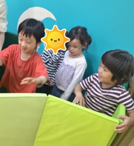 今日は、大きい子が多かったので、スタッフではなく子どもたちがおおかみ役をやりました。とっても上手にできましたよ。おおかみから逃げて、最後にマットの家に入ることも楽しめました。