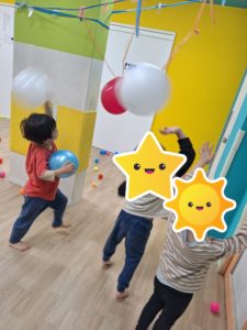 その後はボール遊びをしました。風船も一緒に出して、大きいボールや風船のキャッチボールやアタックをしたり、小さいボールを集めて振らせたりしました。
