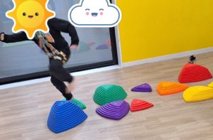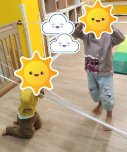 今日の午前中の活動は、「忍者ごっこ」をしました。はじめにゴムの道の通り方の見本を大きな子にやってもらってたらスタート。ゴムの道を通ってスズランテープの森を抜け、ボールをテープの丸に投げ、バランスストーンの中を歩きました。大きい子は忍者のようにかっこよく、小さい子は、一つ一つの活動を楽しみながら行っていました☆ たくさん体を動かすことが出来ましたよ。その後はボールや風船あそびをしました。