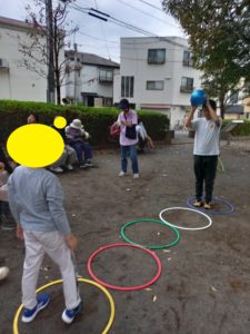 後半は公園に行きフープを並べて両端のフープの中に立ってお友達の名前を呼んでからボールを投げる活動をしました。距離感が難しいお友達もいましたがバウンドさせてお友達になげたりと上手にお友達に渡してくれました😊