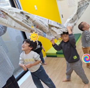 今日の午前中の活動は、新聞紙遊びをしました。大きく繋いだ新聞紙を子どもたちの頭の上でひらひらさせると、両手を広げて触ろうとしたり、頭の上の風を感じたりして楽しんでいましたよ。
