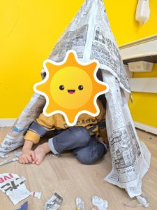 新聞紙プールに入ったり、テントに入る、帽子をかぶる、スリッパをはく、ホウキを作ってお掃除したりして楽しみました。たくさんの新聞紙を体にかけて隠れたり、お布団にして寝たりしていましたよ。
