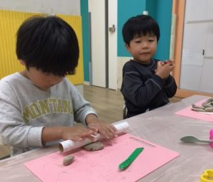 コーナー遊びでは粘土とお絵描き、スタンプをしました。