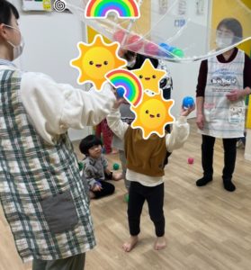その後はボール遊びをしました。傘をさかさまにしてスタッフがもち、子どもたちにボールを投げてもらいました!上手にたくさん入れることができているお友だちもいましたよ。スタッフと大きなボールでキャッチボールを楽しんだりもしました。